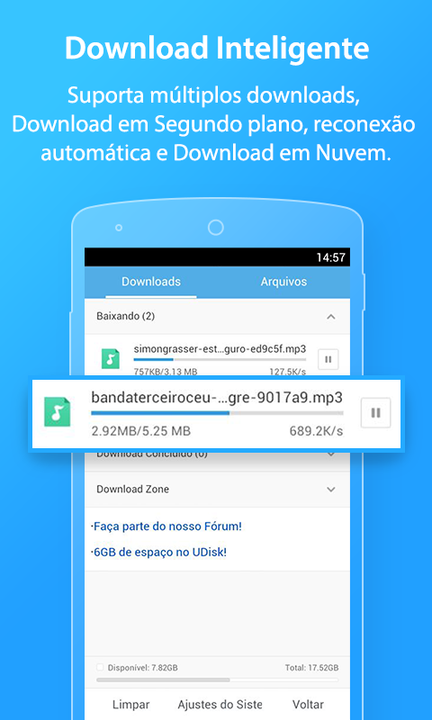 - Gerenciador de Downloads: baixe músicas, filmes e muito mais;